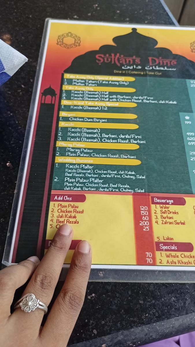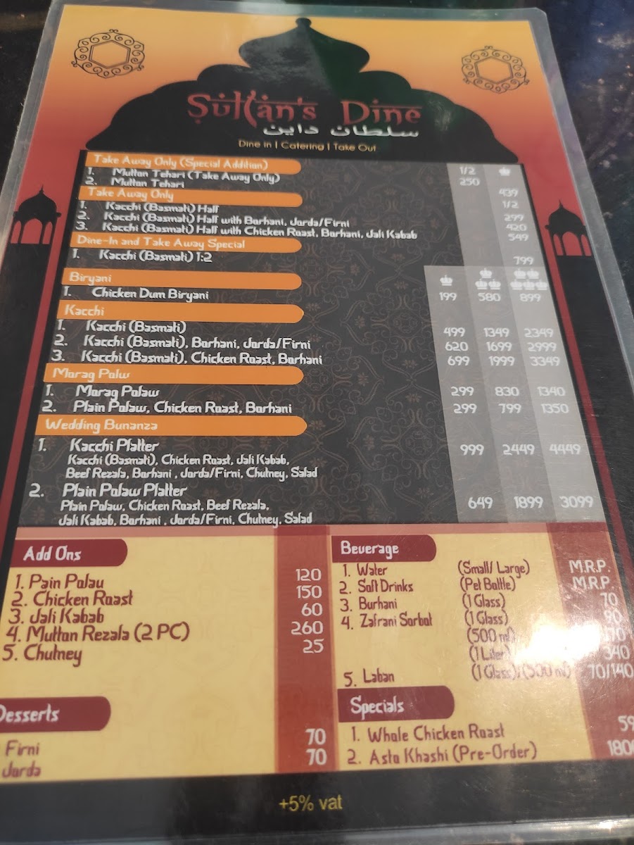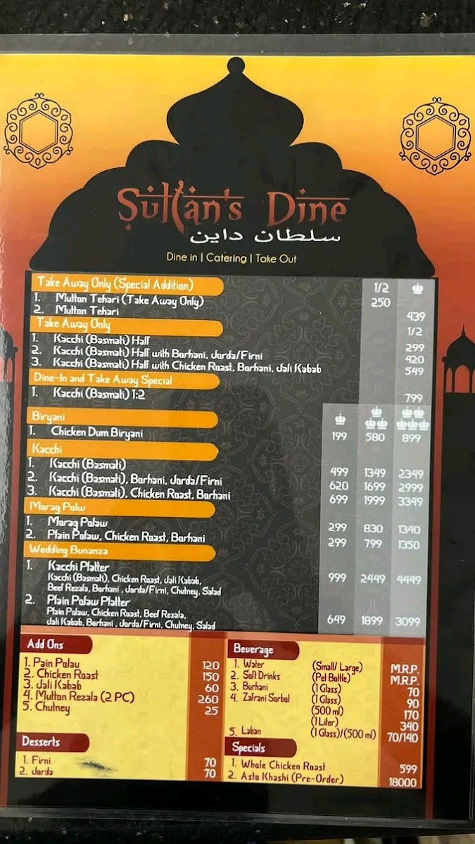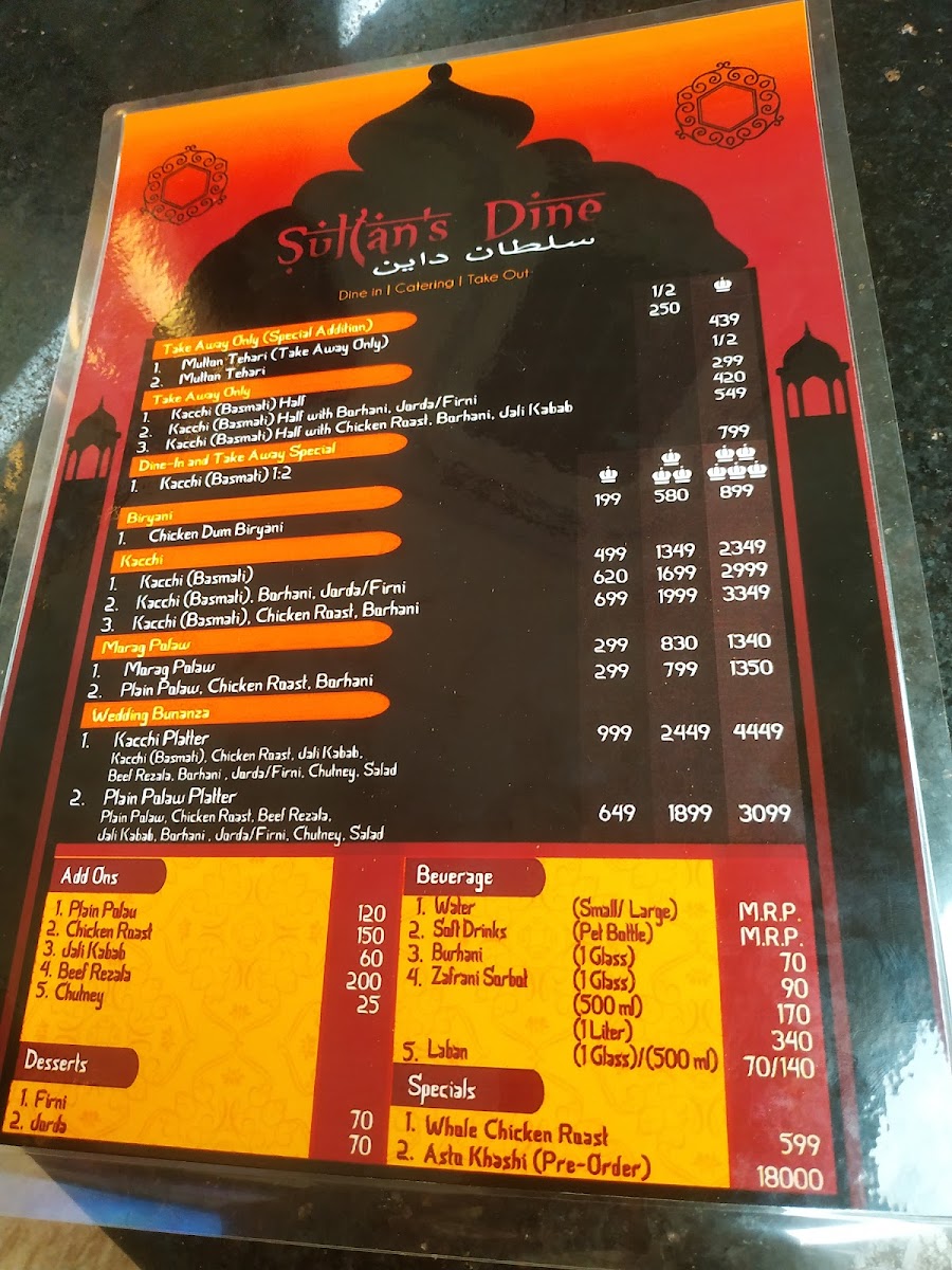 Consists of basmati kacchi, chicken roast, jali kebab, beef rezala, borhani, chutney, salad & choice of jorda or firni