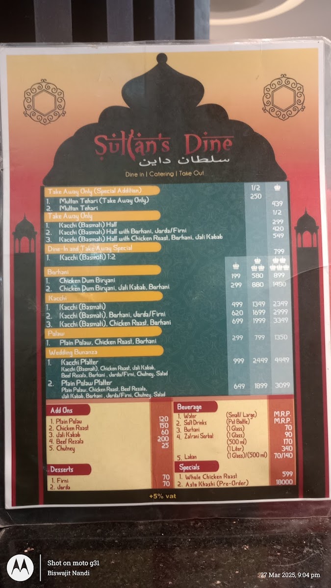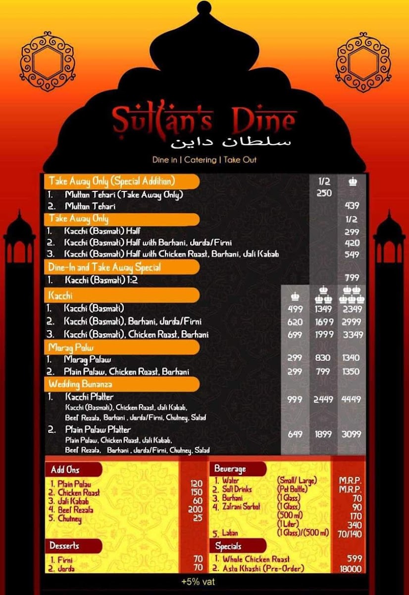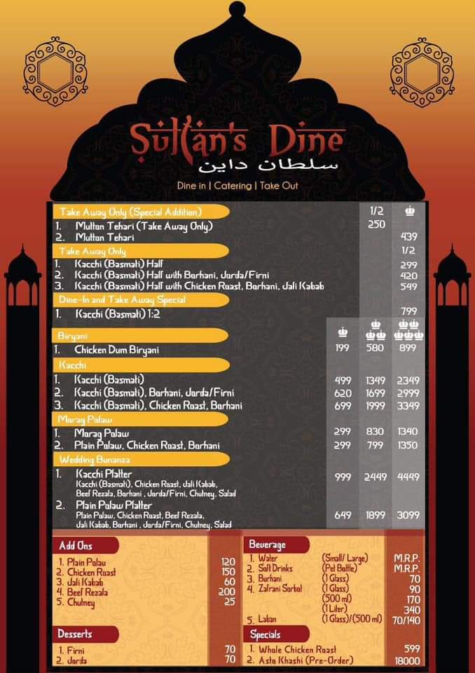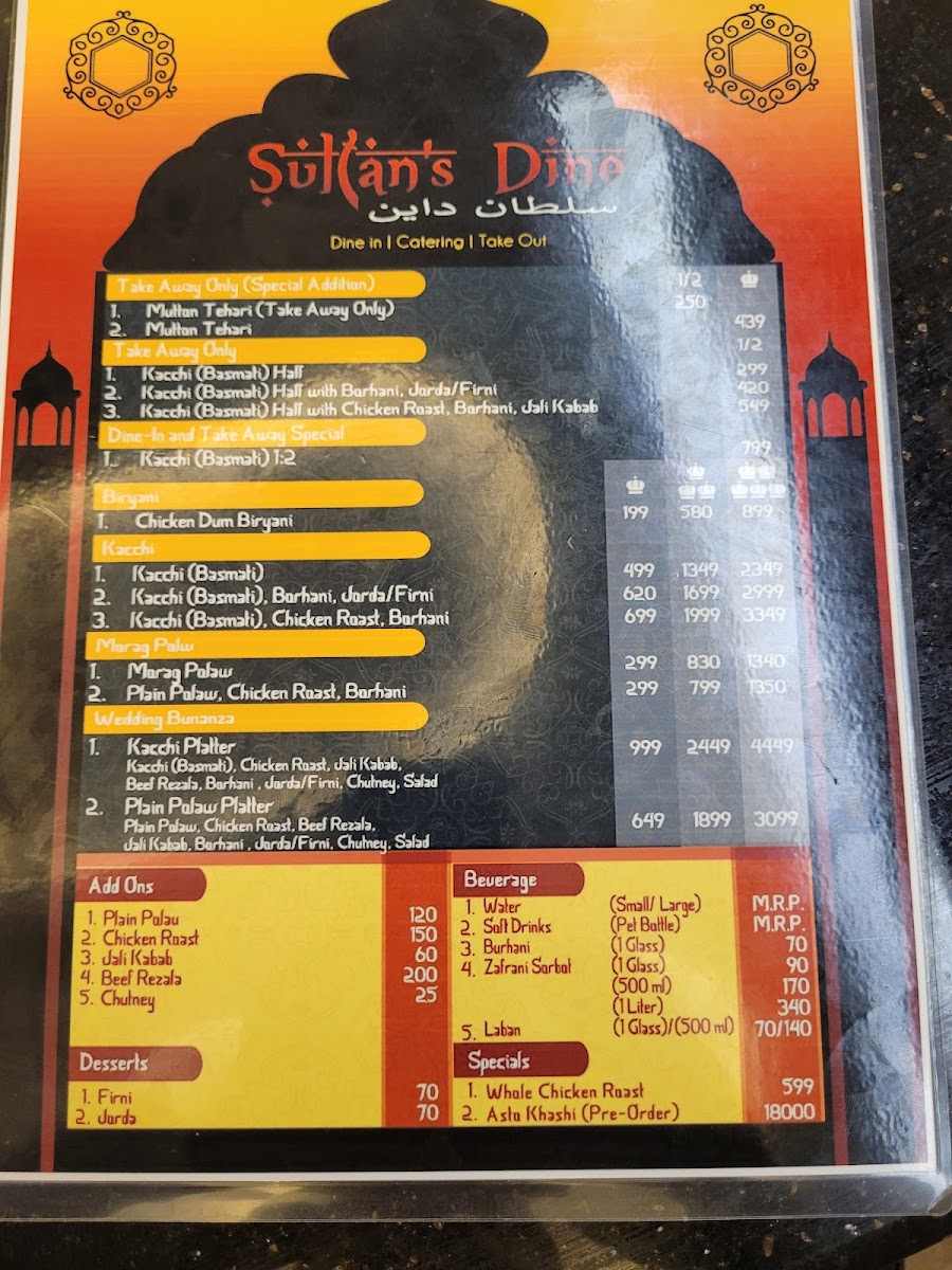 Sultan's Dine Khulna offers a diverse and rich menu, showcasing traditional Bangladeshi flavors with a special focus on rice-based dishes. Their signature Basmati Kacchi Combo is a standout, available in different variations such as Basmati Kacchi with Chicken Roast & Borhani priced at 1:5, 1:1, and 1:3, all complemented by either Jorda, Firni, or both. The Kacchi Platter is another excellent option, offering a choice of Jorda or Firni to pair with the aromatic rice and meat. For those seeking something a bit more special, the Sultan's Dine Special offers a Half Basmati Kacchi with a choice of Chicken Roast, Borhani, and Jali Kebab, or a fuller portion with Full Basmati Kacchi. To quench your thirst, the beverage options include 500 ml and 1 Litre bottles, as well as refreshing Borhani in a glass. The curry selection features rich dishes like Beef Rezala and Chicken Roast, both of which pair wonderfully with rice. If you prefer a simpler meal, the Plain Polao Combo comes with Chicken Roast & Borhani in the same variations as the Basmati Kacchi options. As sides, diners can enjoy Plain Polao, Chicken Jali Kebab, or a flavorful Chutney. The menu at Sultan's Dine Khulna offers something for every palate, making it a fantastic destination for both casual meals and special gatherings.
